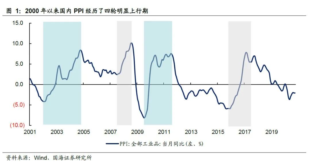 那么,在这一轮PPI上行阶段股市将会有哪些表现?本文试图通过回顾过往国内PPI上行周期情况,以及不同上行周期下股市的表现(包括市场整体、不同板块以及板块内部)来寻找相似的规律,并以此为基础给出后续转债市场的配置思路。