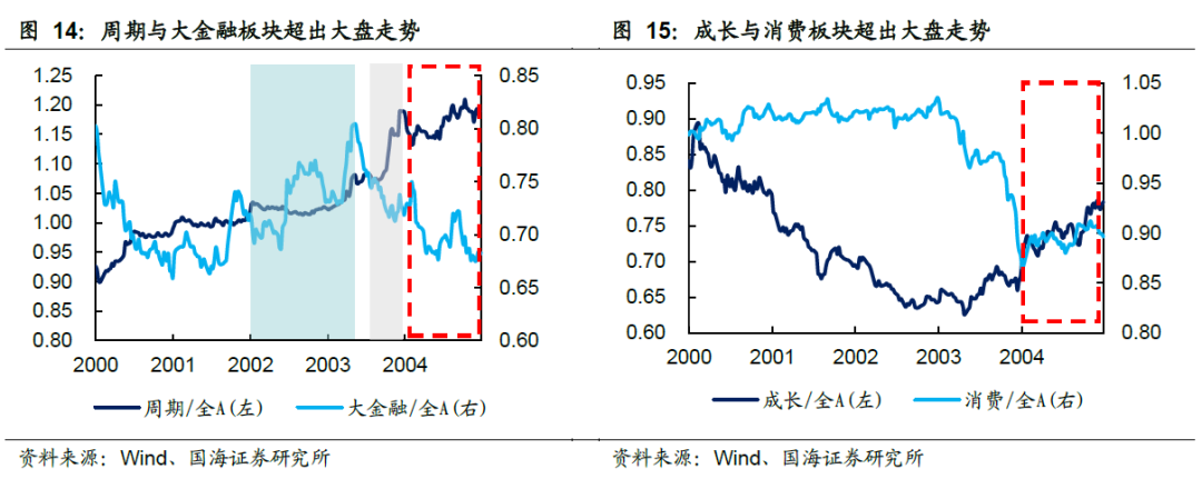在2002.02-2004.10这段PPI上行期中,从整体板块表现来看,行业风格可以大致分为3个过程:(1)2002.02-2003.03,金融和周期好于成长和消费,其中大金融板块表现最为突出;(2)2003.09-2004.01,随着非典疫情过后PPI再次上行,周期板块远远跑赢大盘;(3)2004.01-2004.10,成长和消费板块整体表现相对占优,其中成长板块比消费板块更强。
