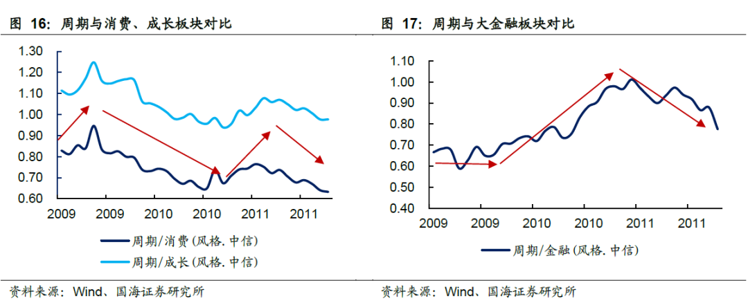 在2009.07-2011.07这段PPI上行期中,行业风格同样可以分为3个过程:(1)2009.08-2010.09,周期板块在经历了前期的快速上涨后(股市提前对四万亿刺激计划有反应),表现反而不如消费和成长风格;(2)2010.10-2011.03,随着PPI短暂回落后的再次上行,周期板块占优;(3)2011.04-2011.07,周期板块再次走弱,消费和成长走强,其中消费板块比成长板块更强。