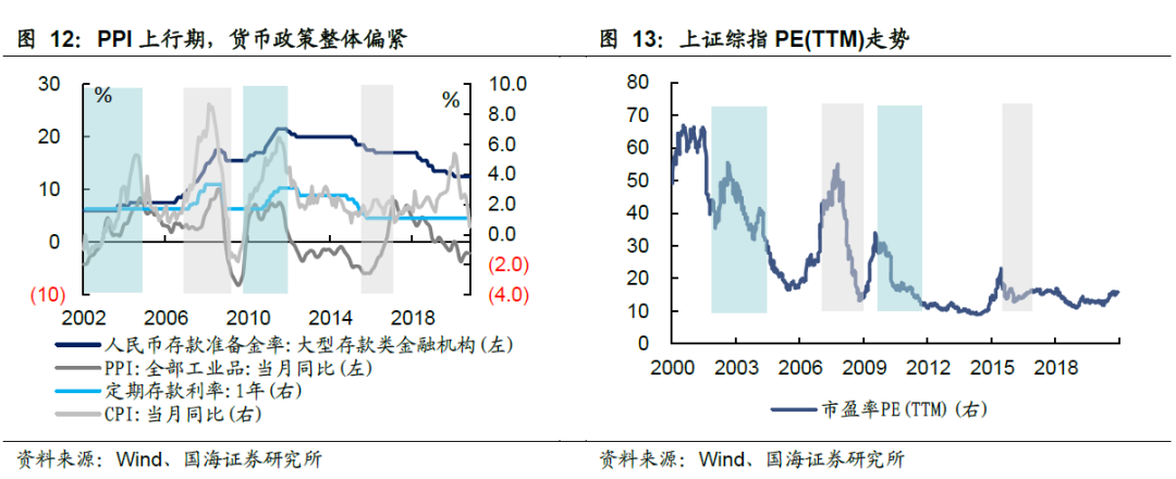 另一方面,2014年之前,PPI与CPI走势相一致,两者上行期间央行货币政策整体偏紧,上行期间市场整体估值均出现了调整。2016年,为配合供给侧结构性改革,央行货币政策保持稳健中性,市场整体估值波动不大。总体来看,在PPI上行阶段,市场估值难有较大幅度的抬升。