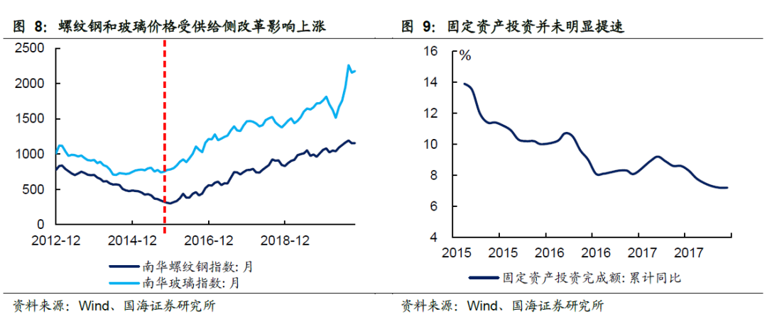 (4)2015.12-2017.2:供给侧结构性改革推动原材料价格上涨。2015年底,供给侧结构性改革开始实施,煤炭、钢铁等行业供给量减少的情况下,上游相关原材料价格均出现了不同程度的上涨,进而推动了PPI的上行。但是,当时国内固定资产投资增速并未抬升,国内经济增长也仍然面临压力,所以这一轮PPI上行也是成本推动型通货膨胀。
