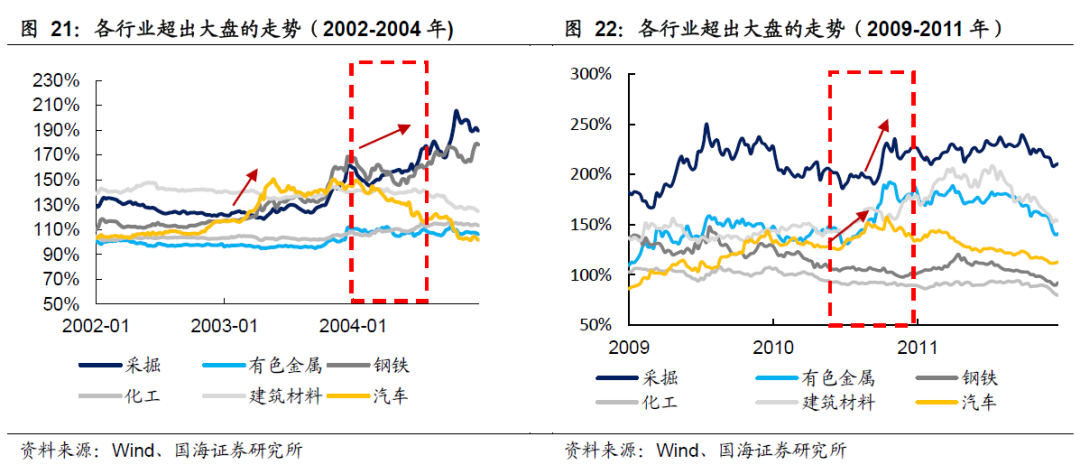 PPI上行阶段,周期板块内部的行业表现也会呈现结构性特征。从2002年和2009年这两轮PPI上行阶段下的行业盈利表现也可以看出,上游行业在PPI上行后半期的盈利修复更为明显。体现在股市表现上而言,中下游行业上涨多出现在PPI上行前半期,而上游行业上涨多出现在PPI上行后半期。