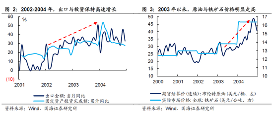 (1)2002.2-2004.10:需求拉动为主,叠加成本抬升。2002年,在加入WTO后,国内出口和投资保持高速增长,工业品需求大幅抬升。期间虽然遭遇了非典的冲击,但短暂影响之后国内经济重新恢复了上涨势头,固定资产投资增速和出口增速保持在30%左右。