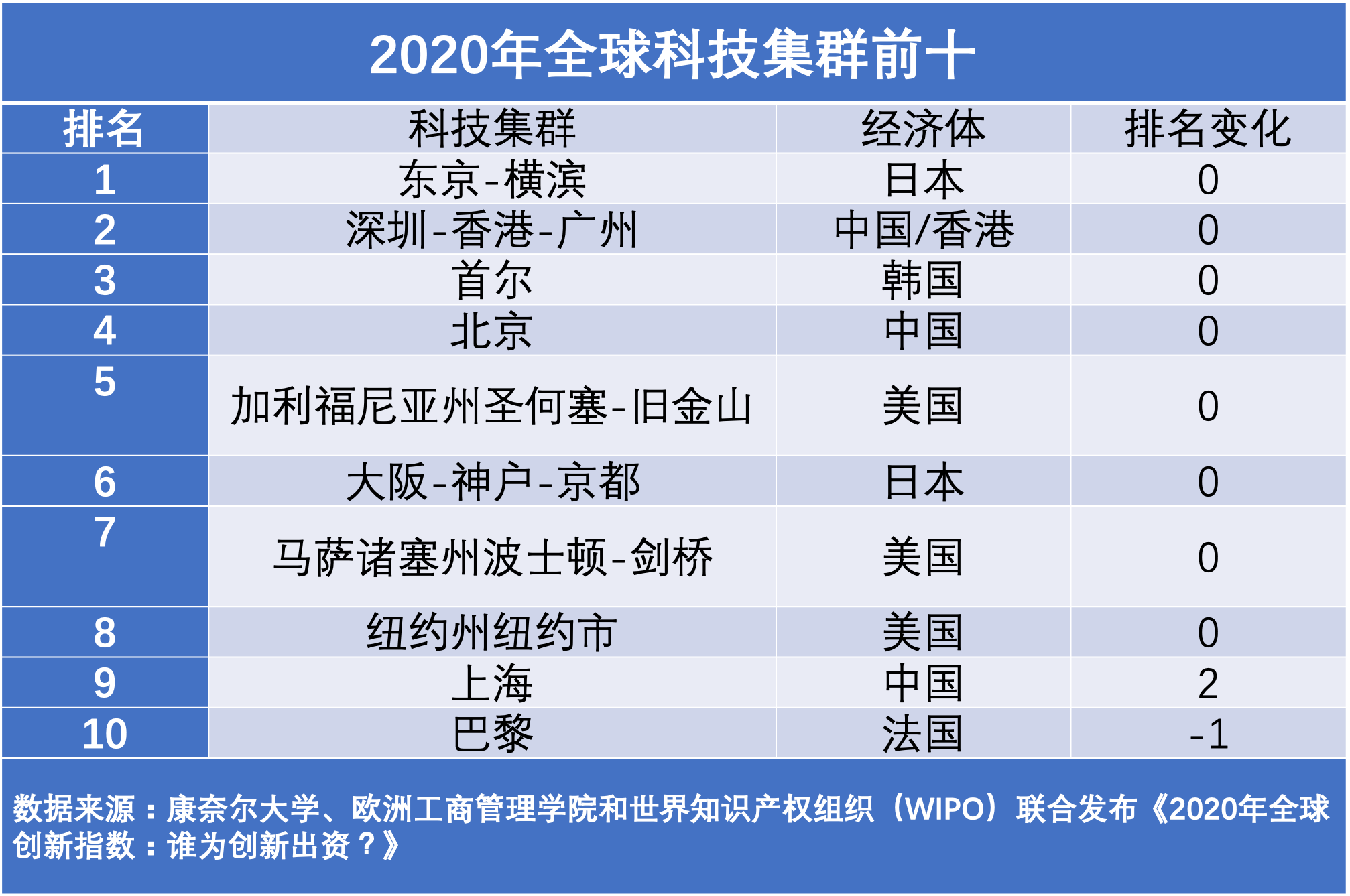 2020年,全球科技集群前八的排名保持不变,但是上海从第 11 位上升到第 9 位,因此巴黎和圣地亚哥分别下降一位,排名分列第10位和第11位。更普遍来看,除了排名已很靠前的深圳-香港-广州和北京之外,所有入榜中国科技集群的排名也都有所提升。