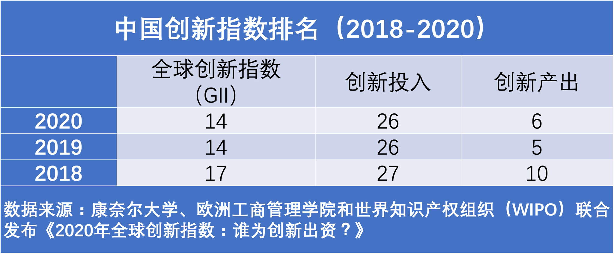 把时间拉长来看,从2018年到2020年,中国在全球创新指数(GII)排行榜上由第17名跻身到第14名,创新投入和创新产出两个指标也呈整体上升趋势。