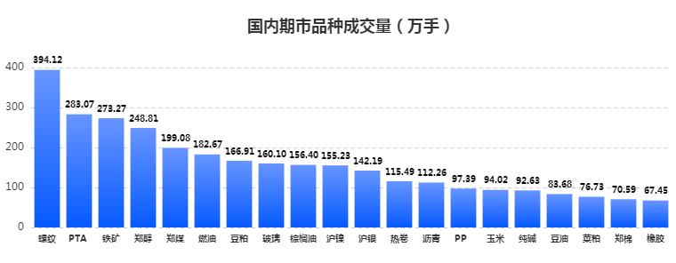 今日期市总成交量突破4000万手,创历史新高,成交额环比增加27.37%至3.045万亿元。其中,螺纹钢成交量翻番至394万手,占期市总成交比例近10%,铁矿石及郑醇等热门品种成交量显著增加亦有较大贡献。沪铜为环比成交量增幅最大的品种,高达124.5%。成交额方面,铁矿石仍居首位,沪镍排名提至第二位。