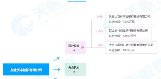 天眼查信息显示,玄盛资本控股有限公司分别持有长白山农村商业银行、延边农村商业银行5.6%、8.26%的股权。
