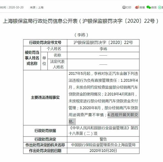 2015年4月,中国正通汽车服务控股有限公司设立上海东正汽车金融有限责任公司。今年10月,上海东正汽车金融公司因违规开展关联交易被上海银保监局处罚。
