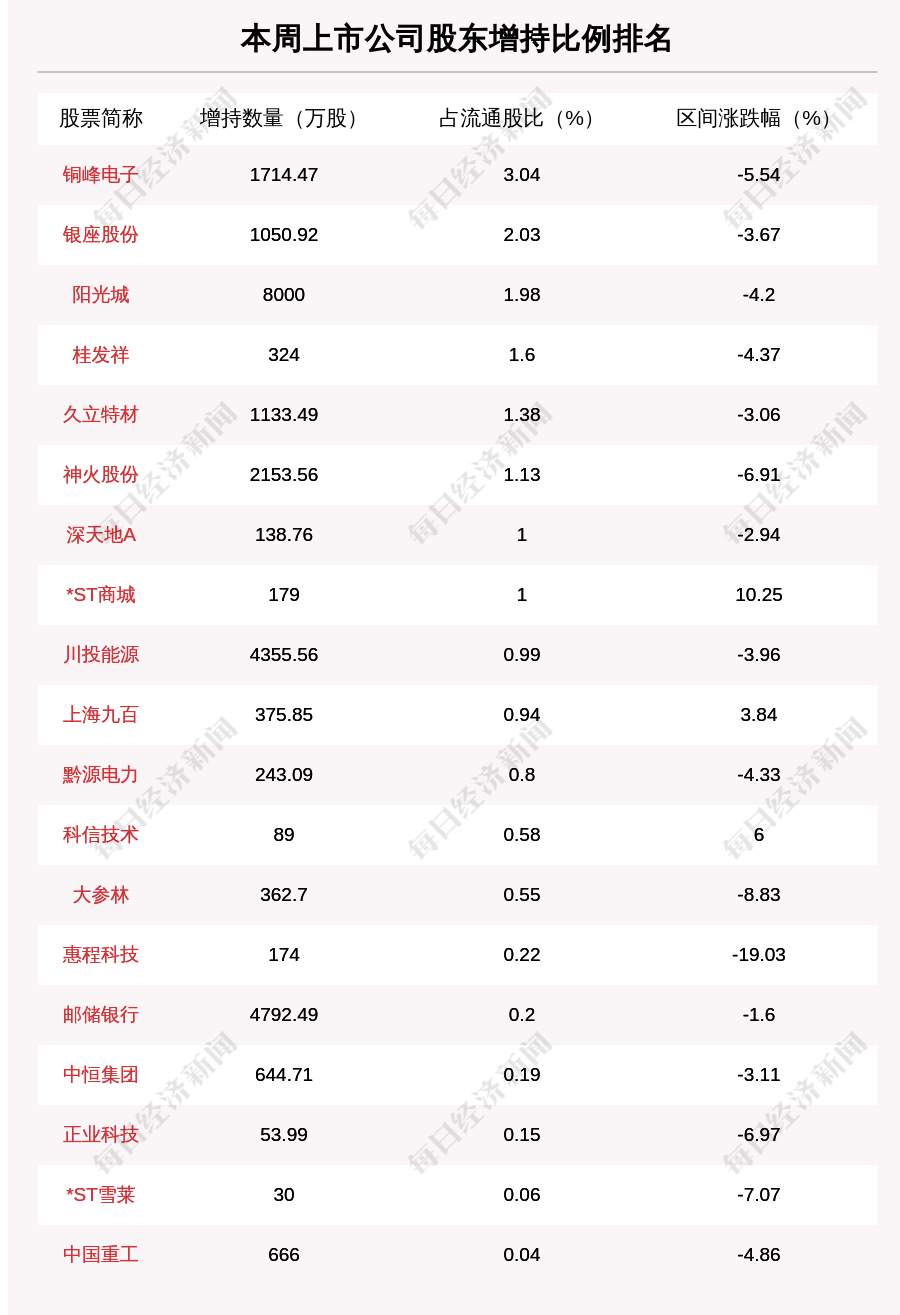 从增持力度上来看,本周获股东增持比例(占流通股比)前三的公司是铜峰电子、银座股份、阳光城,增持比例分别为3.04%、2.03%、1.98%。