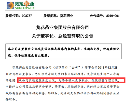 2018年12月28日,关彦斌辞任葵花药业董事、董事长及总经理职务,辞职理由为“因个人年龄的原因,从公司长远发展角度出发,为给年轻人更多机会,优化经营管理团队”。随后,关彦斌女儿关玉秀通过董事会选举成为公司董事长,另一位女儿关一成为公司董事及总经理。