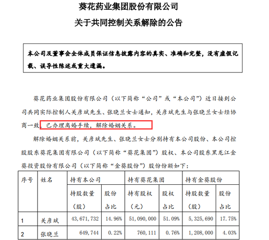 2017年7月12日晚间,葵花药业公告,公司共同实控人关彦斌、张晓兰已办理离婚手续,解除婚姻关系。离婚时,关彦斌和张晓兰共同签署了股权分割协议,后者同意将所持有的葵花药业股票64.97万股、葵花集团中76.01万元股权、金葵股份中120.8万股股份,归关彦斌所有。