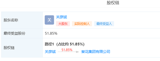 天眼查披露的股权结构显示,关彦斌持有葵花集团有限公司51.85%的股份,持有黑龙江金葵投资股份有限公司22.41%股份,间接持有葵花药业33.5%。