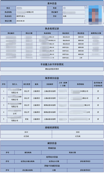 进入保代个人信息页面可看出,相比过去从业信息,此次新增多个栏目,比如专业能力水平评价情况的结果;持续培训情况,2019年与2020年的培训是否已经完成;“诚信信息”则包括奖励信息以及处罚信息。