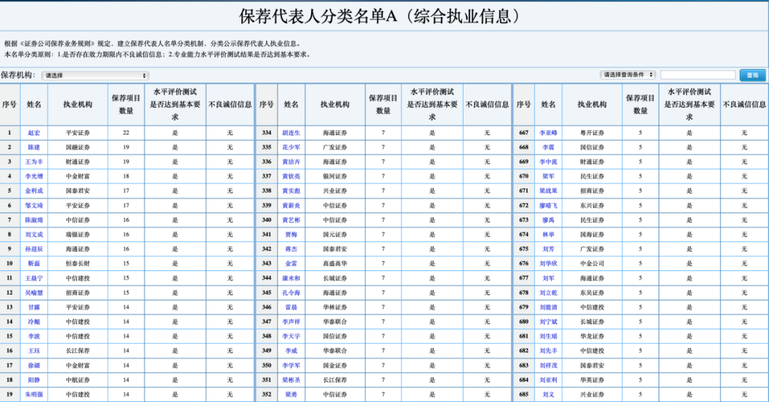 据了解,保荐代表人分类名单A根据是否存在效力期限内不良诚信信息及专业能力水平评价测试结果是否达到基本要求,分类公示全体保代执业信息。