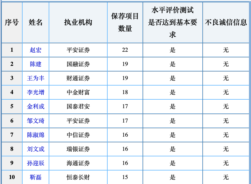 A名单显示,中证协实际上依据保代的保荐项目数量进行排名。有趣的是,项目数量前10名中,有4名都具有“平安投行”的背景。