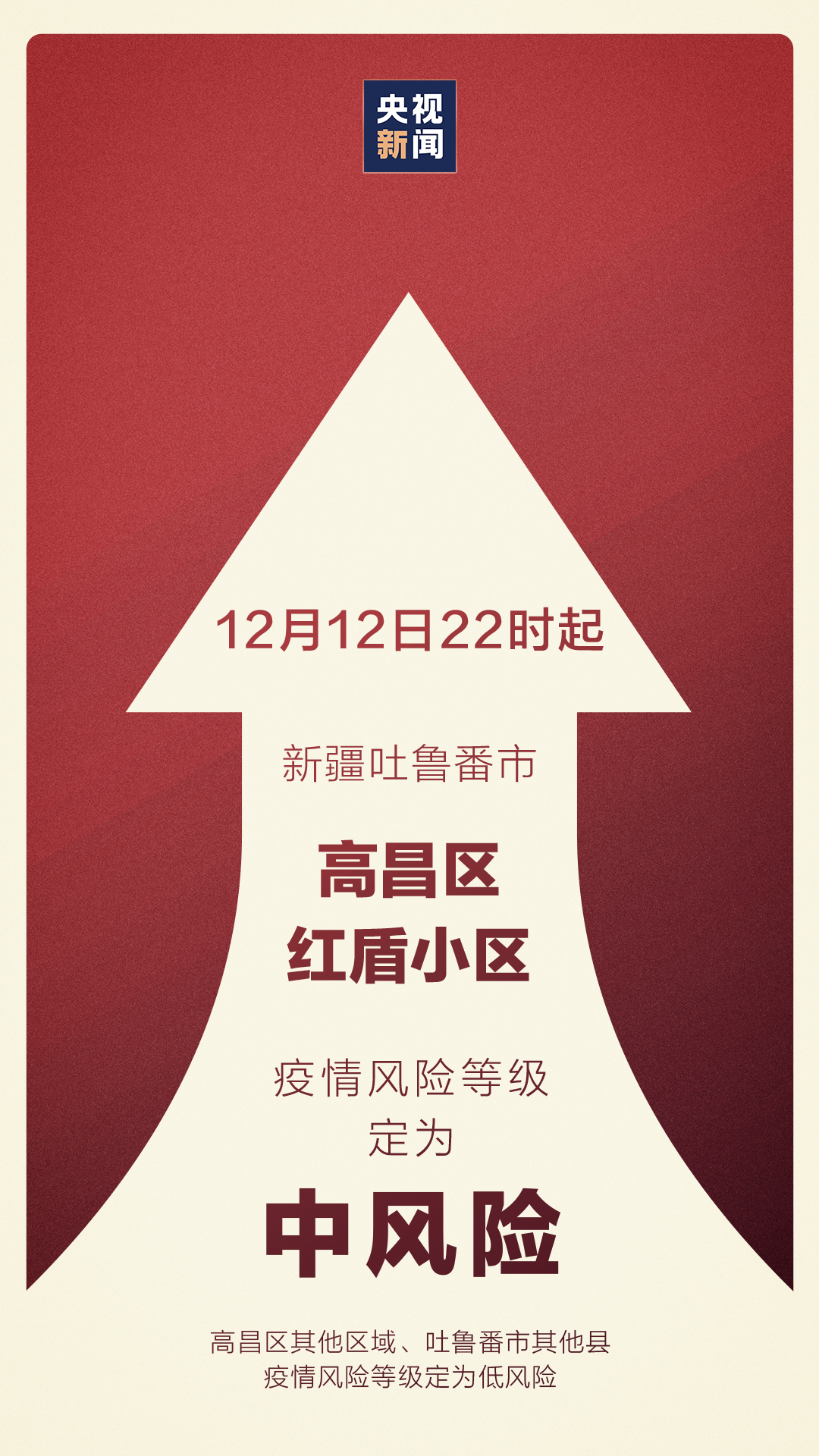 12月12日,新疆吐鲁番市人民政府新闻办公室通报高昌区疫情防控工作最新情况,吐鲁番市红盾小区疫情风险等级升为中风险。