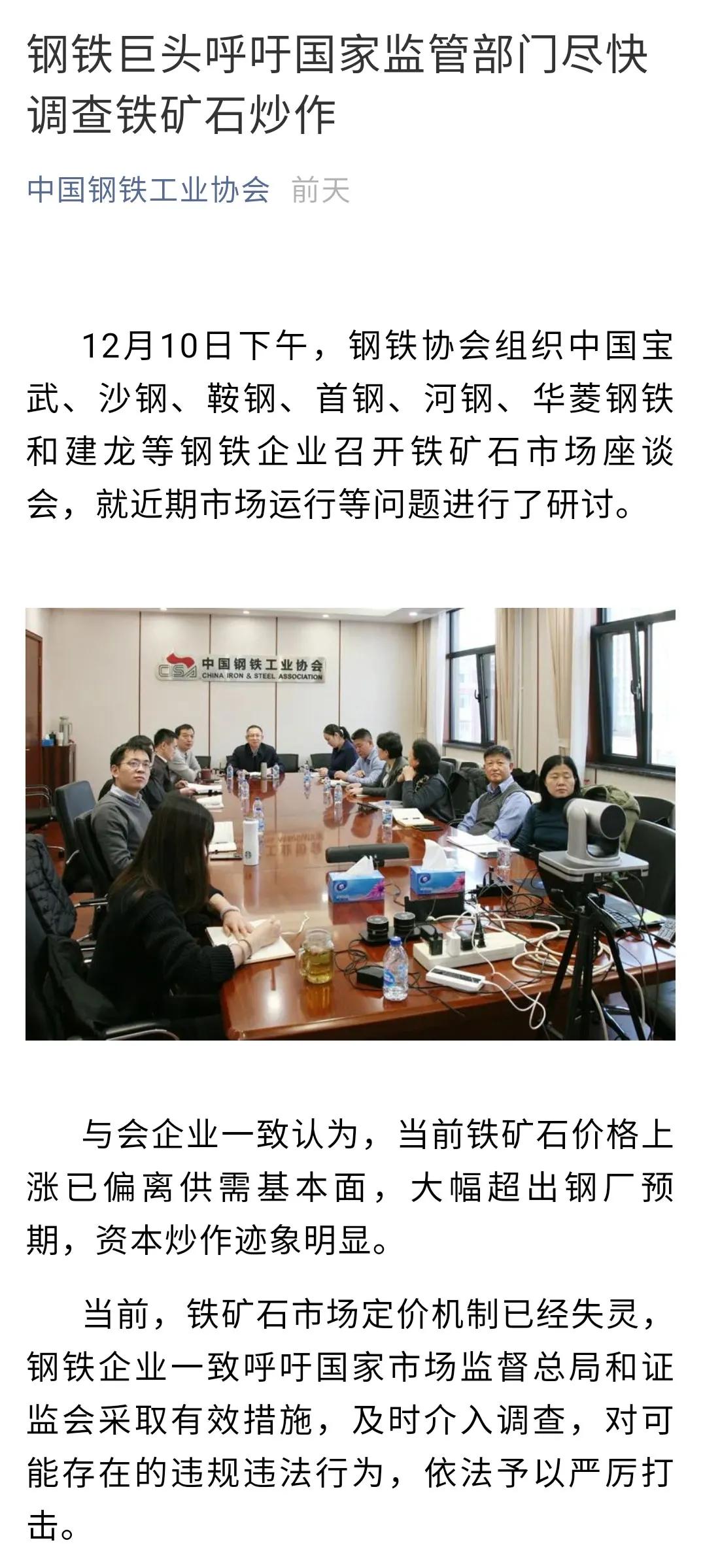 12月11日,中国钢铁工业协会官方微信以《钢铁巨头呼吁国家监管部门尽快调查铁矿石炒作》的标题发文,直言铁矿石价格上涨已偏离供需基本面,市场定价机制已经失灵,钢铁企业一致呼吁国家市场监督管理总局和中国证监会采取有效措施。