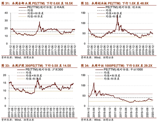 本周全部A股估值水平下行。截至12月11日收盘,全部A股PE(TTM)下行0.6X至18.5X,处于历史估值水平的76.0%分位数。本周创业板估值下行,PE(TTM)下行1.0X至48.9X,处于历史估值水平的51.1%分位数。代表大盘股的沪深300指数PE(TTM)下行0.5X至14.5X,处于历史估值水平的91.1%分位数。代表小盘股的中证1000指数PE(TTM)下行0.9X至29.2X,处于2014年以来历史估值的34.1%分位数。