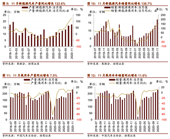 根据中汽协,11月我国新能源汽车产销量分别为19.8万辆和20万辆,环比分别增长17.5%和24.1%,同比分别增长75.1%、104.9%。其中,纯电动汽车和插电式混合动力汽车产销较快增长,增速均超60%。