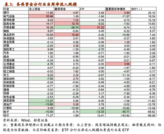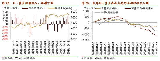 【资金·众寡】外资延续流入,券商ETF大幅申购。12月7日~12月11日期间,资金面总体减弱。北上资金当周净流入69.6亿元;融资资金前四个交易日合计净流出4.95亿元;当周新成立偏股类公募基金合计159.3亿份,较前期基本持平;ETF当周转为净申购。行业偏好上,北上资金净买入规模较高的集中在电气设备、非银金融、医药、银行等;融资资金集中买入食品饮料和医药。重要股东净减持规模和计划减持规模均有扩大。