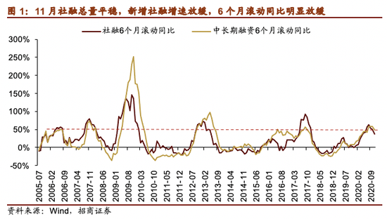 11月社融总量数据呈现存量平稳、增量放缓的状态。具体来看,2020年11月新增社融2.13万亿,同比多增1363亿元,但多增幅度继续收窄。另外,存量规模增速今年来首次出现下降,较前期略降0.1%至13.6%。新增社融6个月滚动同比增速回落至37.3%。