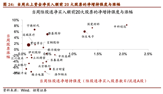 个股方面,北上资金净买入规模最高的为贵州茅台,净买入规模29亿元;其他净买入较多的包括隆基股份、恒生电子、东方财富等;净卖出规模较高的包括洋河股份、京东方A、海康威视等。