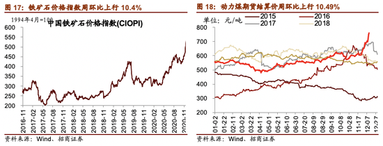 本周螺纹钢、铁矿石、动力煤等资源品价格继续上行。截至12月11日,螺纹钢价格为4140.00元/吨,周环比上升2.32%;钢坯价格3728.00元/吨,周环比上涨3.33%;铁矿石价格指数547.25,周环比上行10.4%,相比去年同期上行62.24%。截至12月11日,焦炭期货结算价为2551.0元/吨,周环比上行0.59%;焦煤期货结算价为1566.0元/吨,周环比上行3.50%;动力煤期货结算价为760.8元/吨,周环比上行10.49%。