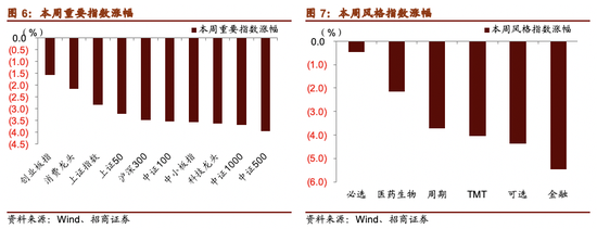 本周市场普跌,宽基指数全线下跌,其中上证50、沪深300、中证100、中小板指、中证500、中证1000等跌幅均超过3%,创业板指跌幅相对较小,从成交来看,本周全周平均日成交金额不足8000亿,较前几周成交明显缩量,尽管市场普跌,但北向全周依然净流入69.6亿,连续六周单周净流入,近六周累计净流入规模达845亿,从大类板块上来看,必选消费相对抗跌,金融、可选、TMT、周期均跌幅较深。