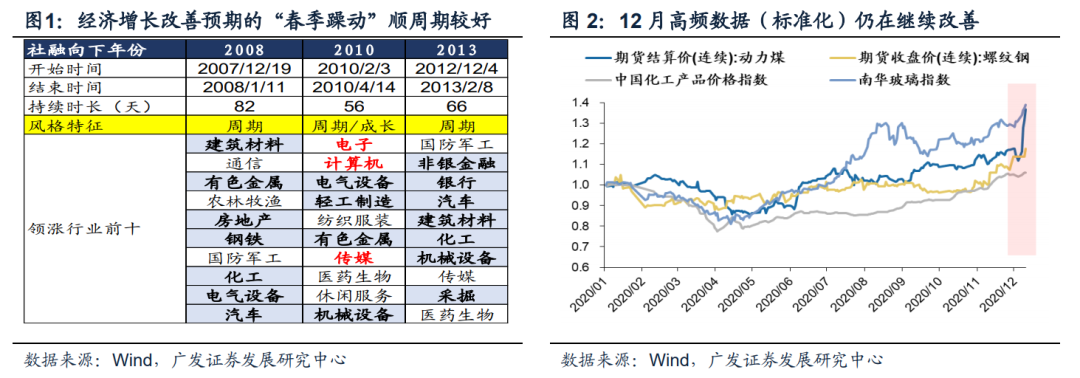 21年的“春季躁动”建议继续深化“估值降维”:(1)21年“春季躁动”经济增长呈现顺周期修复的惯性,企业盈利处于上行阶段后期,而金融条件处于信用紧缩初期,“春季躁动”顺周期属性板块跑赢的概率较大——历史上08年、10年和13年初的“春季躁动”经济增长预期比较强,“春季躁动”风格仍以顺周期为主:08年初出口增速仍维持20%以上的高增长;10年初基建投资维持20%以上高增长,地产投资维持30以上高增长;13年初投资者对新一轮经济回升周期预期持续强化。(2)我们判断21年初经济增长超预期相较货币宽松超预期的概率更大,“春季躁动”将继续深化“估值降维”——当前,辉瑞BioNTech新冠疫苗已经获得FDA经济授权,中国制造的疫苗也已经抵达埃及,都有利于强化经济增长预期,进一步深化“估值降维”。而国内外流动性环境边际宽松的空间有限。