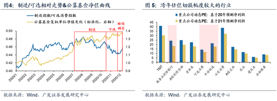 从公募基金的净值曲线&制造/可选消费的相对走势来看:12月以来公募基金正在积极调仓。我们认为:“跨年估值差”较大且21年“业绩修复弹性”逻辑强化的“出行链(服务业剔除银行)+出口链(部分制造和可选消费)+再通胀(部分资源品)”将是近期机构投资者调仓/建仓的重要方向。