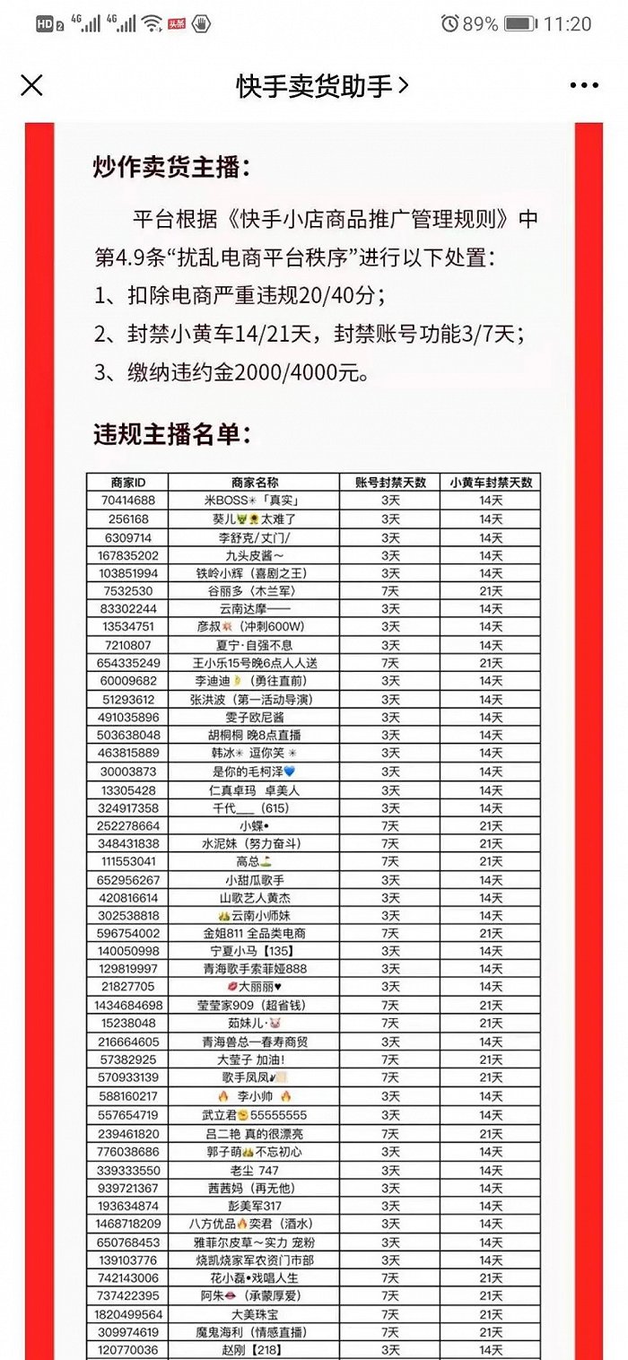 与此同时,快手加大了对违规带货的处置力度。12月,葵儿太难了、凡凡良心电商、丑嫂精品美妆等美妆博主因“剧本、演戏炒作卖货”违规被快手官方处置,处以封禁小黄车14/21天、封禁账号功能3/7天、缴纳违约金2000元/4000元等处罚。其中,葵儿太难了粉丝基数为849.6万,称得上快手平台上的头部主播。