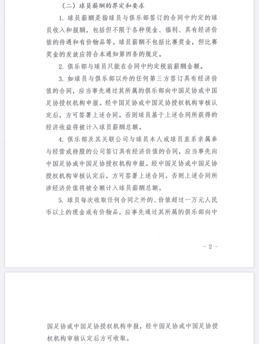 新政对于球员的薪酬做了比较详细的界定和要求,其中规定球员每次收取合同之外的、价值超过一万元的现金或物品,应该先向足协申报。如果球员要和俱乐部以外的第三方签署有经济价值的合同,应该先在足协审核,否则要算进薪酬总额。