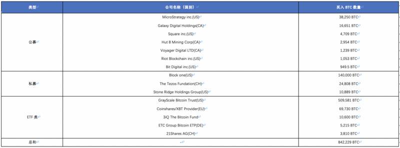 同样地,我们也会发现,自今年下半年以来,越来越多的机构开始买入比特币。例如,美国移动支付巨头Square买入5000万美元的比特币,占公司总资产1%;资产管理公司MicroStrategy宣布累计购买了4.25亿美元的比特币,这样的名单也有长长的一串: