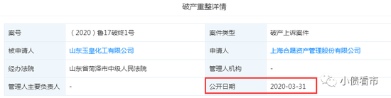 债务危机爆发后,今年3月玉皇化工被上海合晟资产管理股份有限公司申请破产重整,案号为(2020)鲁17破终1号。