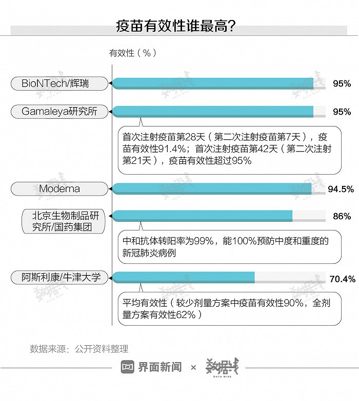 据界面数据统计,目前已公布三期临床数据的5款疫苗中,美国辉瑞公司和德国BioNTech公司、俄罗斯Gamaleya研究所以及美国Moderna研发的疫苗有效性均超过90%。其中,美国辉瑞公司和德国BioNTech公司共同研发的疫苗,以及俄罗斯Gamaleya研究所研发的疫苗有效性为目前最高,达到95%。英国牛津大学和阿斯利康公司开发的疫苗平均有效性最低,为70.4%。