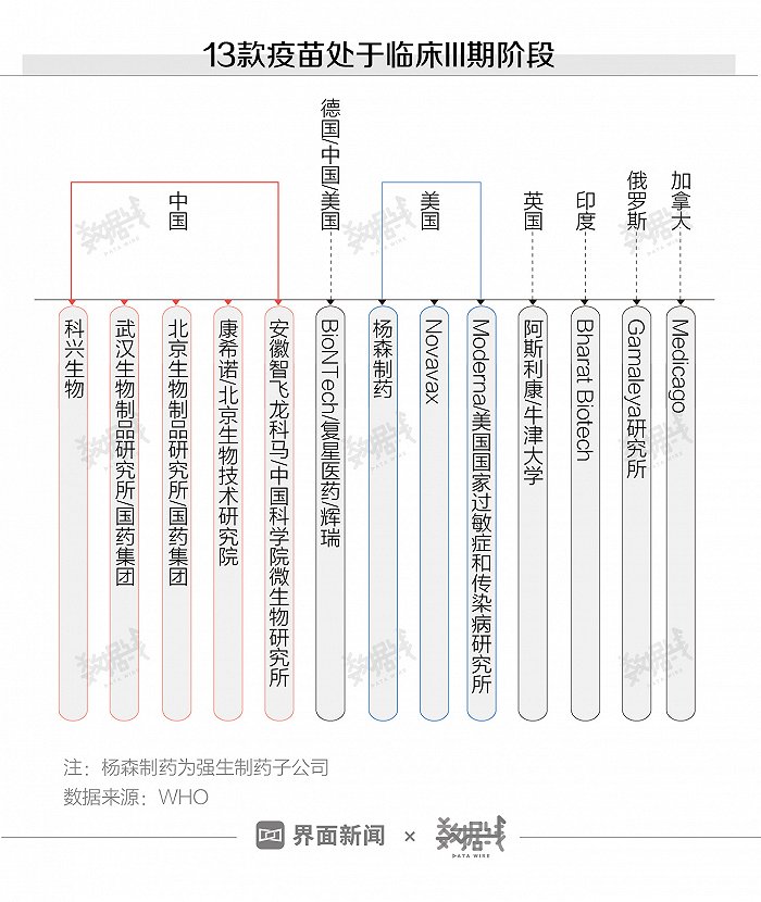 根据WHO最新数据,目前全球已有13款新冠疫苗进入临床三期。其中5款疫苗来自中国。