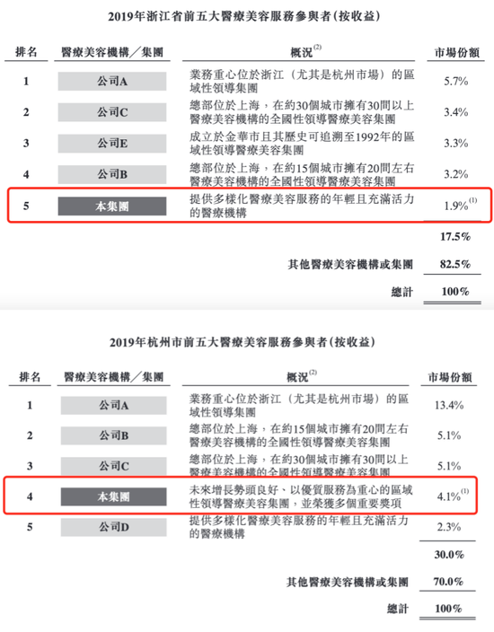 弗若斯特沙利文数据显示,截至2019年12月底,浙江省的医疗美容服务供应商多达850家,杭州市约为300家。按医疗美容服务收入计,2019年浙江最大供应商约占5.7%的市场份额,而瑞丽医美仅占1.9%,在浙江省医疗美容服务市场中排名第五;2019年杭州最大的供应商约占13.4%的市场份额,而瑞丽医美仅占4.1%,在杭州市医疗美容服务市场中排名第四。