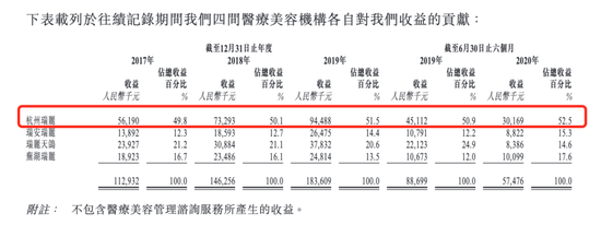 在瑞丽医美这四所美容院中,有一半的营收来自于杭州瑞丽店,且这一比重还在逐年增长。2017年至2020年上半年,杭州瑞丽的营收占总收益的比例分别为49.8%、50.1%、51.5%、52.5%。靠一家店撑起一半的营收,这样的状况又能持续多久?