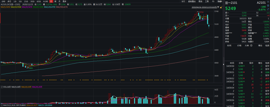 而随着豆一价格疯涨,监管部门开始关注,交易所率先发力提醒大豆市场价格波动较大,提醒客户理性参与、合规交易,随后国家粮食局根据需要研究再暂缓部分玉米和大豆轮入。在一系列措施的调控下国产大豆突然开始降温,上周尾还在猛涨的期价,本周开盘直线下跌,豆一真的跌落神坛相忘于江湖了吗?今日主力01合约报收5249,跌幅为3.07%。