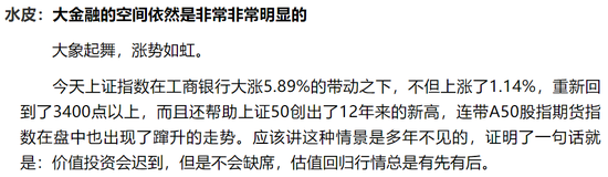 不过,当时看好银行板块的也不只是邱冠华,著名券商中金公司、著名评论家水皮等,都看好银行股和金融股的行情。