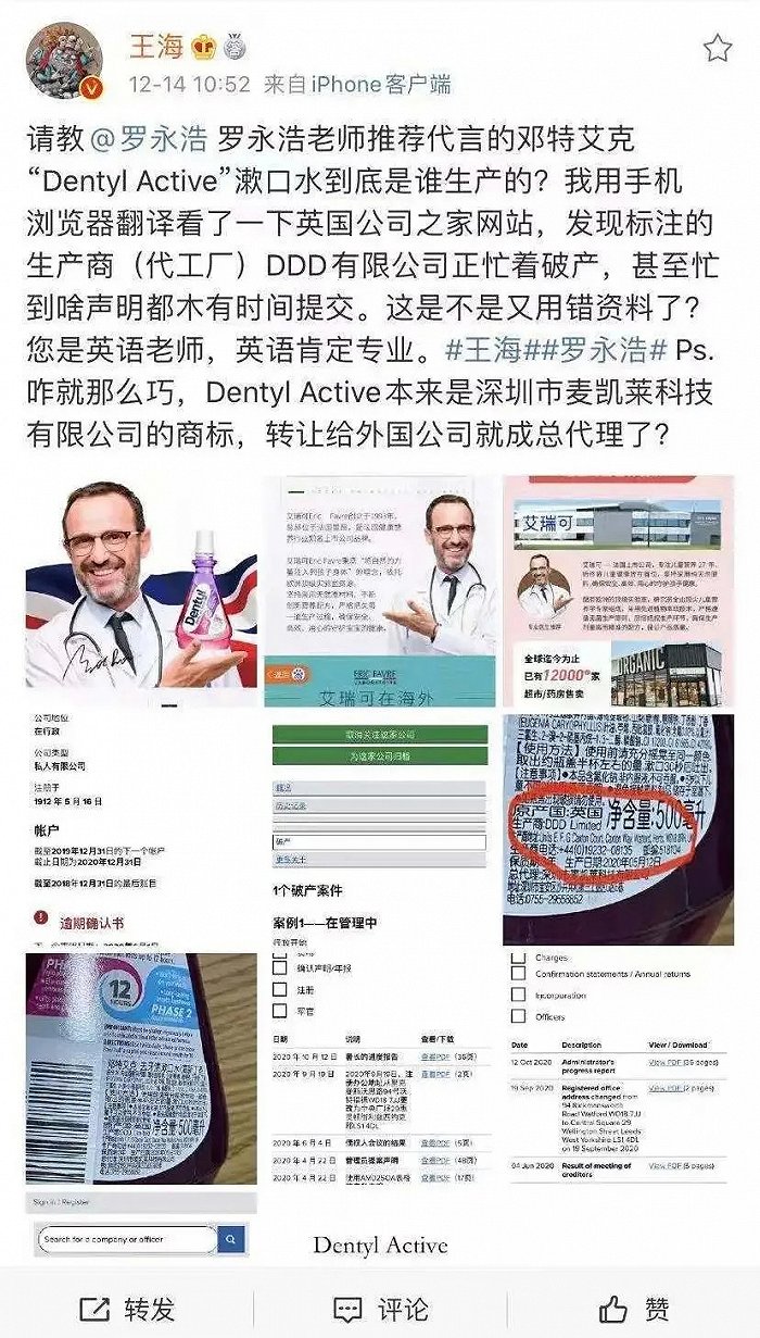 王海方面还指出罗永浩带货的“邓特艾克”漱口水涉嫌虚假厂名厂址、假冒进口商品,作为英语老师的罗永浩显然知情,这是在有意坑骗消费者。搜索应用上显示,邓特艾克品牌是由深圳麦凯来科技有限公司申请注册。