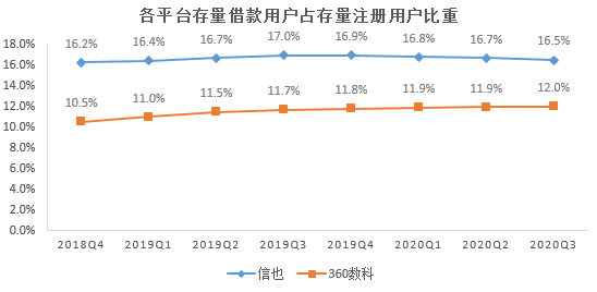 从各平台各报告期存量借款用户占同期存量注册用户的比重来看,自2019年以来,信也科技该比值始终维持在16.5%左右,而360数科该比值则由2019Q1的10.5%升至2020Q3的12%,虽然增幅不大,但是结合其高出信也科技4000万的注册用户数据来看,维持微增的前提下,其累计借款用户规模与信也科技的差距有望进一步拉大。