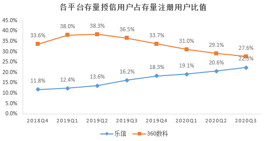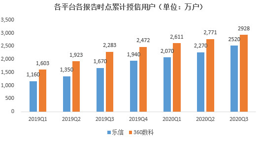 因信也科技未公布其各报告期授信用户,故授信用户仅选取了360数科及乐信两家数据进行对比。