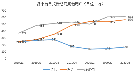 从复借用户来看,受上文提及的首借用户规模下滑影响,信也科技外,360数科、乐信的复借用户量都在提升,后两者更为明显。