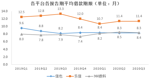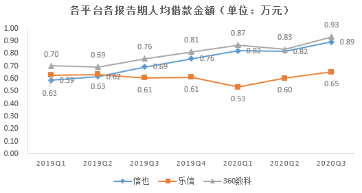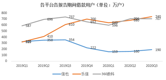从各平台报告期的借款用户规模来看,乐信表现较为强势,从2019年一季度的320万户增2020年三季度的740万户,360数科较为稳定的在700万左右上下浮动。信也科技则从2019Q1的320万户降至2020Q3的190万户。