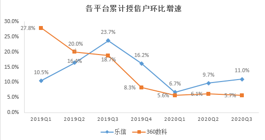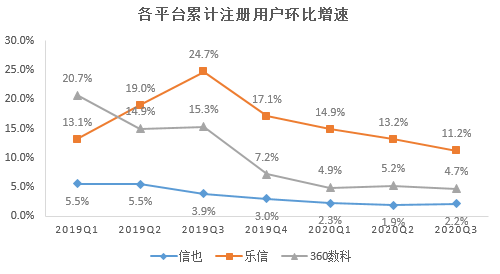 截至2020年三季度末,除乐信注册用户环比增速依然保持双位数增长外,360数科、信也科技增速都已是单位数增长。