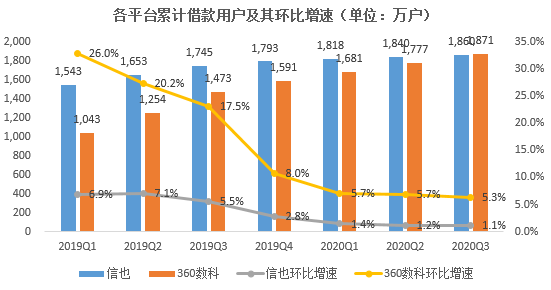 360数科累计借款用户数量也于2020年Q3季度超过信也科技。