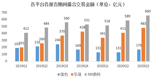 从单季度撮合交易金额来看,360数科是三大平台当中唯一单季度撮合交易金额超500亿元的企业,且早在2019年三季度就达到了560亿元。乐信本年三季度撮合金额达到483亿元,按其现有增速来看,极有可能在Q4季度交易金额突破500亿元。