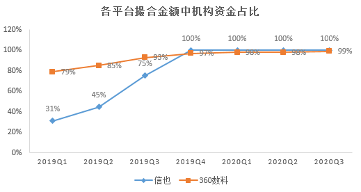 机构资金占撮合交易量比重方面,乐信未公布相关数据,暂不考虑,从信也科技及360数科数据来看,进入2020年以来,两大平台机构资金在各报告期的撮合交易量中的占比均达到了95%。