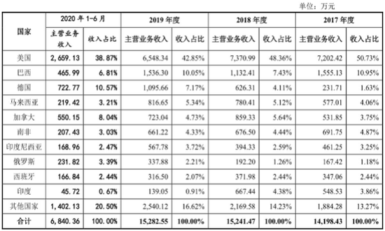 整体来看,严牌股份的产品主要销往美国、巴西、德国、马来西亚、加拿大、南非、印度尼西亚、俄罗斯、西班牙、印度等市场。其中,美国为最大出口地之一,2017年至2019年,该公司销往美国的收入占外销收入的比例分别为50.73%、48.36%、42.85%。其中,严牌股份及美国子公司中大西洋对美国客户销售的产品主要为丙纶机织滤布、芳纶机织滤布、PPS无纺滤布、涤纶无纺滤布和芳纶无纺滤布等产品。2017年至2019年,该等主要产品销售收入合计占来源于美国销售收入的比例分别为80.60%、80.71%、76.53%。